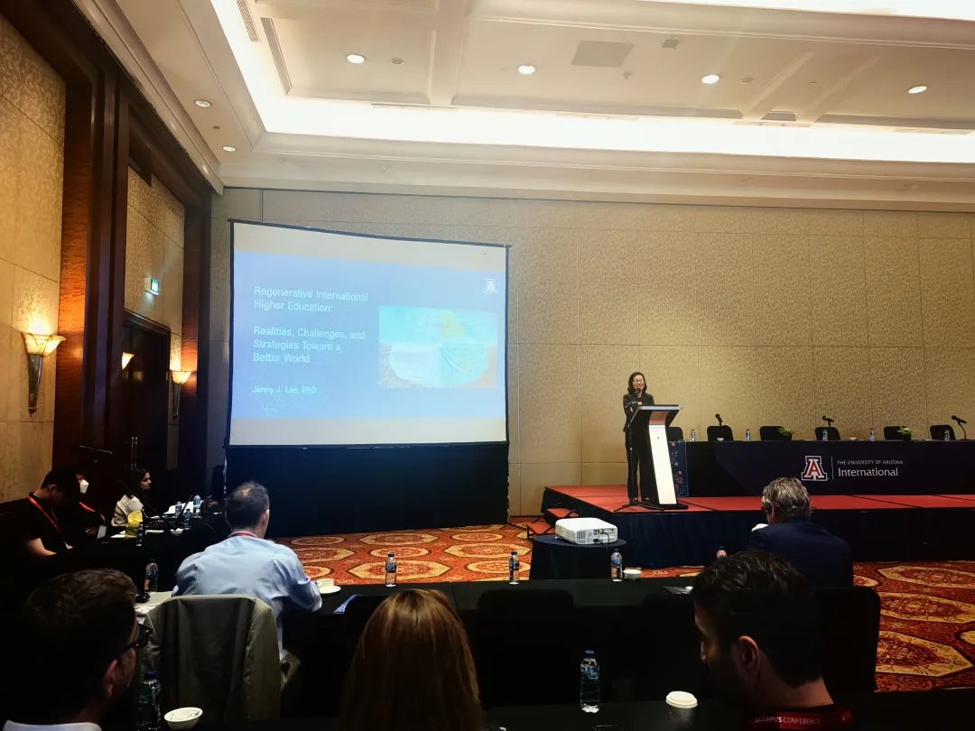日本AV 负责国际交流与合作事务的副校长Jenny Lee作《国际高等教育的再生:挑战、现实和对更美好的世界的承诺》主题报告。