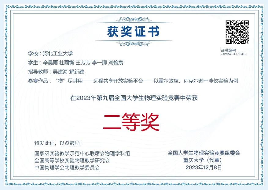 我院学生刘翰宸参加的项目’“物”——远程共享开放实验平台——以霍尔效应、迈克尔逊干涉仪实验为例’获得了自选类全国二等奖。