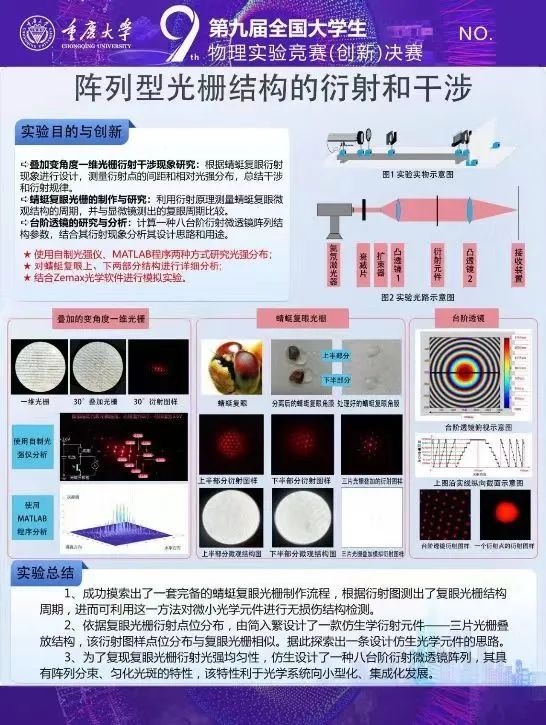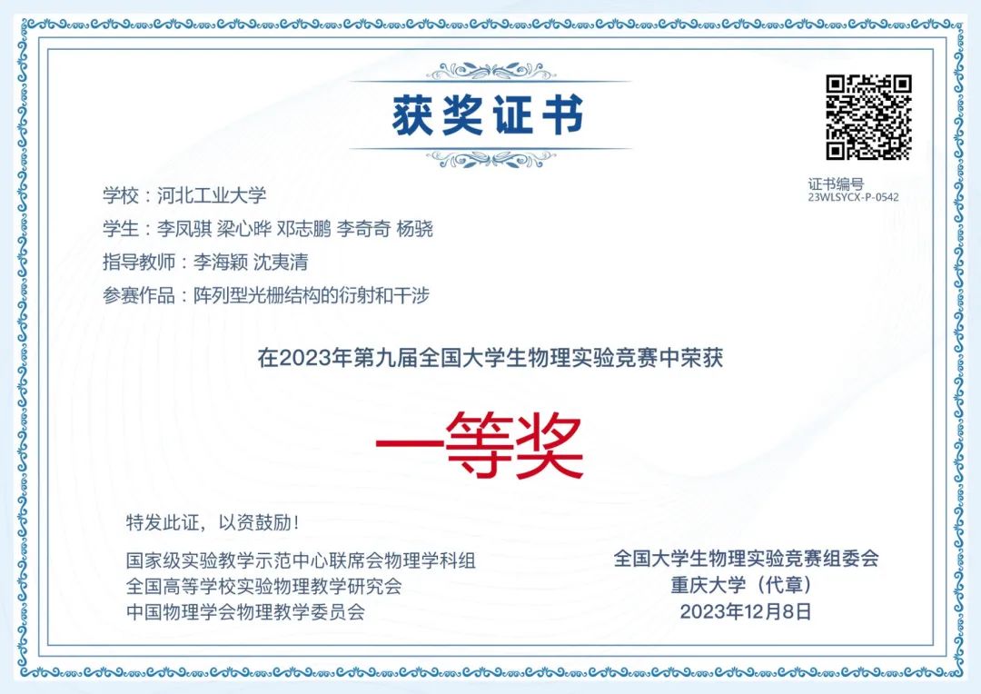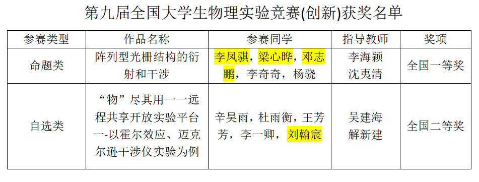 我院学生李凤骐、梁心晔、邓志鹏在李海颖和段雪松老师的精心指导下,凭借扎实的理论基础、出色的动手能力和稳定的心理素质,经过激烈角逐,从全国参赛的2000余支队伍中脱颖而出,命题类“阵列型光栅结构的衍射与干涉”项目进入全国总决赛,获得了命题类全国一等奖。