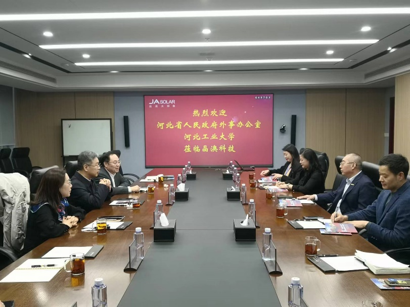 校企双方与会人员进行了欢快的热烈交流,充分交换了思想与理念、信息与技术资源,初步达成了“10+X” 专项行动合作意向,校企双方将签署“全面战略合作协议“,为晶澳科技全球国际化战略提供高质量国际化人才支撑。依托晶澳科技亚利桑那州生产与研发基地与日本AV 开展校企联合培养,并深入探讨带薪顶岗实习、校企联合毕业设计、共建实训基地、导师互聘、毕业生定向就业、定向培养等方面的合作;未来,校企双方将在导师互聘、双师型工程技术人才培养、员工学历提升、高端技术培训、走出去联合国际化办学、毕业生就业、科研合作等方面开展全方位深层次的合作。