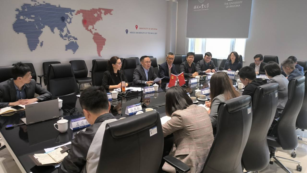 2023年4月14日上午,天津市东丽区区委组织部常务副部长澎湃,东丽区经开区党工委书记、管委会主任李春捷一行就深入推动区校科技合作与高校国际化人才培养来校调研座谈,共商校企协同发展和国际化育人新模式。副校长马国伟出席座谈会,国际交流与合作处处长、国际教育机构党委书记陈鸿雁主持。