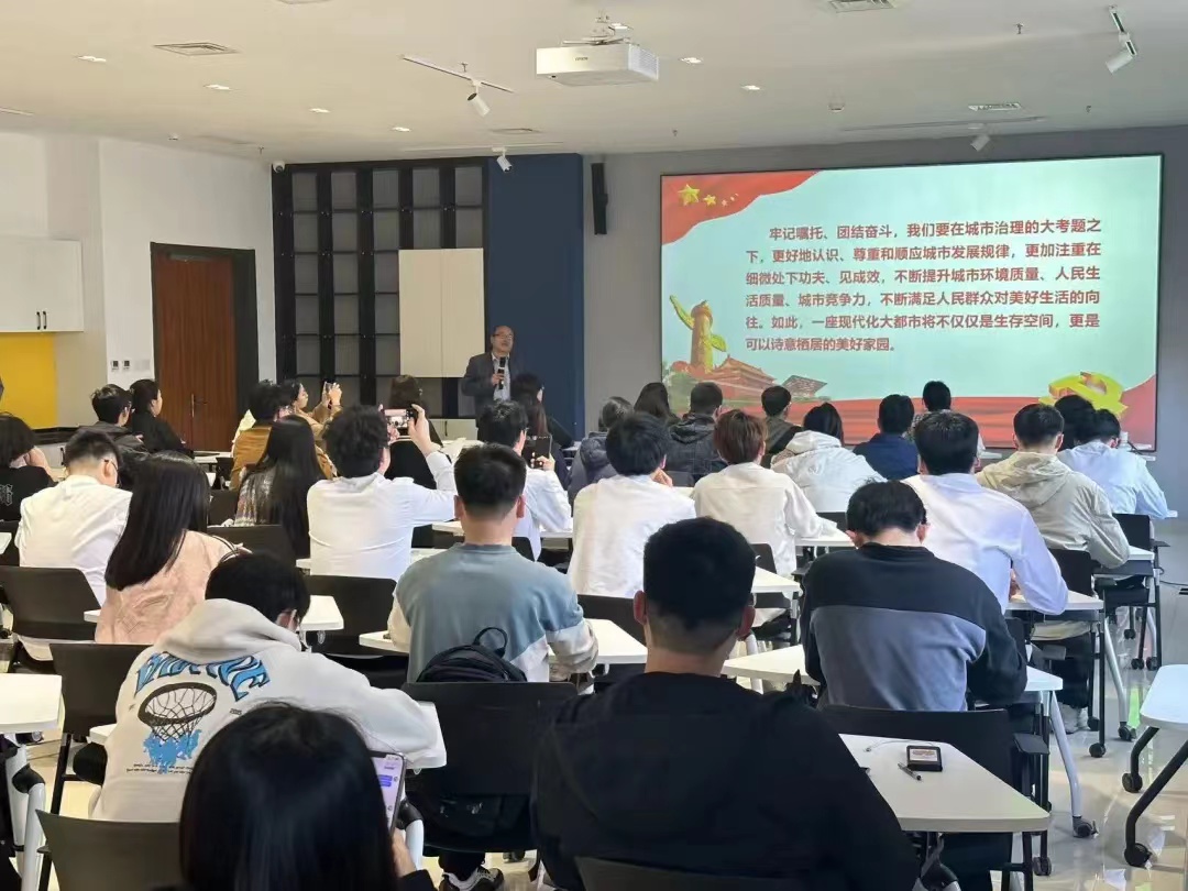 王老师同大家一起学习了习近平总书记重要讲话中的三个关键词“新质生产力”“社会主义现代化大都市”“京津冀协同发展”,并对学生干部在新时代、新征程中如何发挥青年力量与大家沟通交流。他寄语学生干部:要自强不息,在复兴伟业中涵养家国情怀;要高瞻远瞩,在披荆斩棘中提升人生格局;要知行合一,在担当重任中实现人生价值;要革故鼎新,在创新驱动中谋求卓越发展。