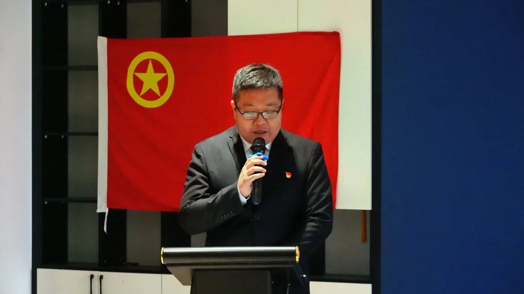 全体肃立高唱《中国共产主义青年团团歌》,校学生会主席许哲恺作为嘉宾代表致辞,分享工作经验并提出期许: