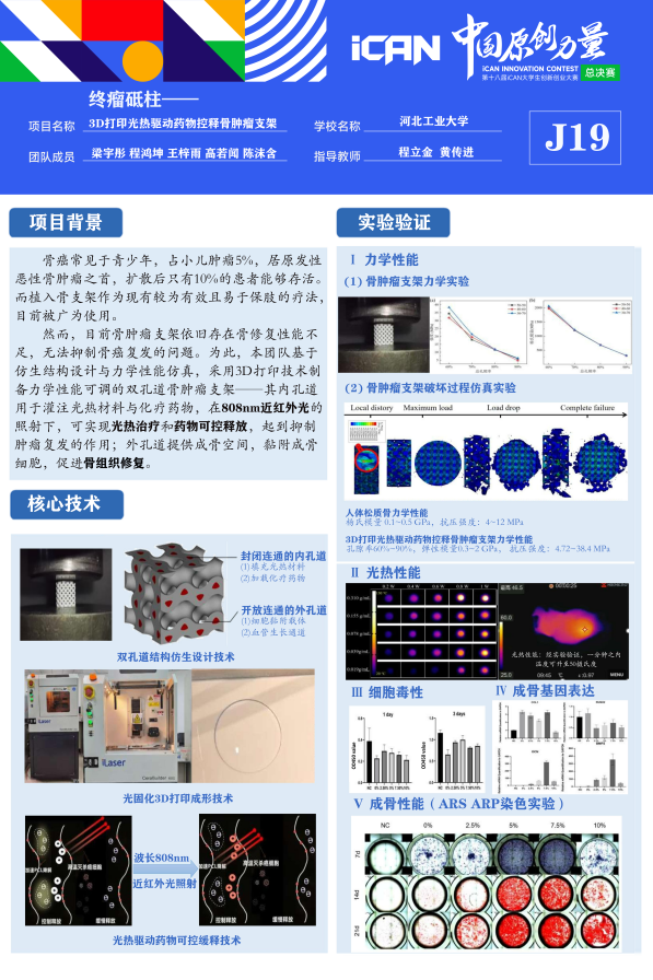 扎实的专业功底让程鸿坤在科创领域如鱼得水。借助日本AV “第二课堂兼职导师训练计划”平台,他加入程立金老师课题组,深耕“3D打印光热驱动药物控释骨肿瘤支架”研究。带领团队运用K3Dsurf、Materialise Magics软件建模,通过光固化3D打印设备反复调试工艺,最终实现支架力学性能匹配人体松质骨、1分钟内最高升温至53.4℃的成果,成功拿下省级重点大创项目,并斩获第十八届iCAN大学生创新创业大赛全国三等奖。